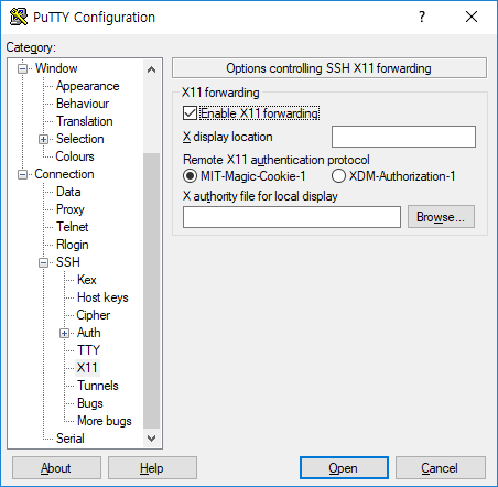 | 1. Host Name에 IP 입력 후 2. Connection-SSH-X11 클릭 3. Enable X11 fowarding 박스 체크 4. X display location -> localhost:0.0 입력 5. Open 클릭 |